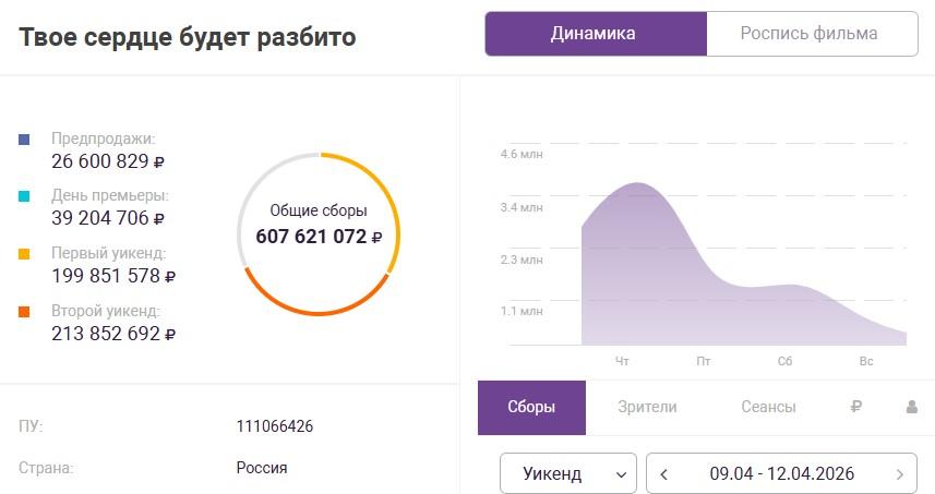 Кинокартина «Твое сердце будет разбито» возглавила российский прокат в апреле. За две недели её сборы превысили 600 миллионов рублей.
