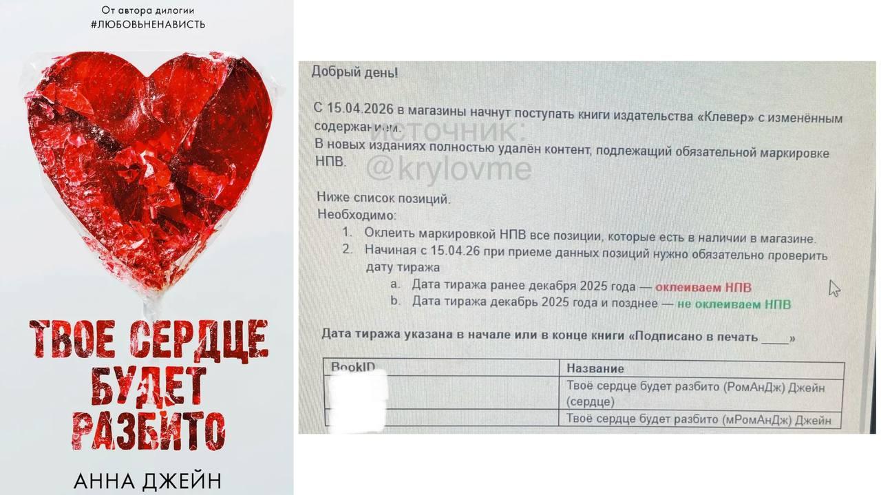 Книжные магазины начали получать тиражи романа «Твое сердце будет разбито» красноярской писательницы Анны Джейн в отредактированной версии. Об этом сообщил книжный блогер Влад Крылов, ссылаясь на уведомления издательств об «измененном содержании».