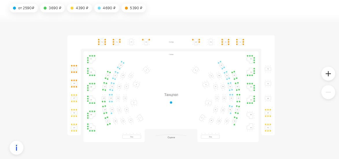 На текущий момент свободными остаются 70 мест на втором этаже и 131 место на первом. Количество мест на танцполе не уточняется.