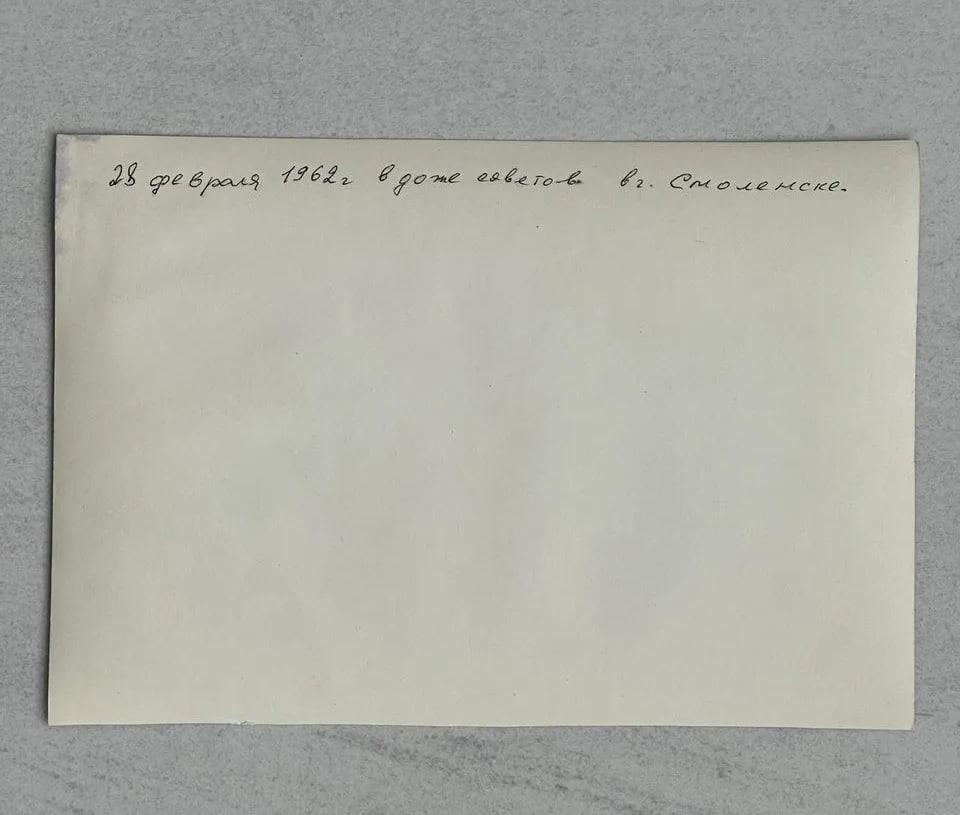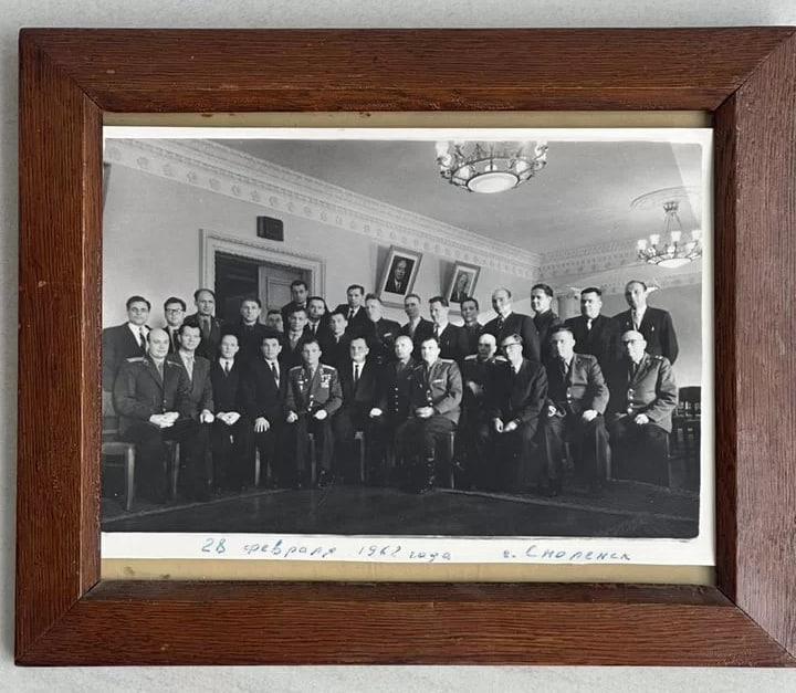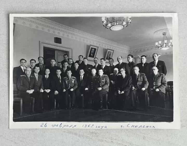 На снимке, сделанном 28 февраля 1962 года в зале Дома Советов Смоленска, запечатлена группа из примерно тридцати мужчин в военной и гражданской одежде. Среди них находится Юрий Гагарин, посетивший город вскоре после своего легендарного полёта в космос.