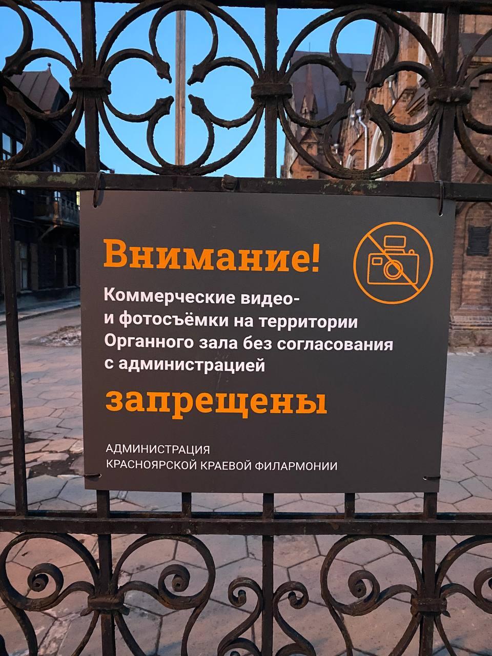 На ограждении органного зала в Красноярске разместили табличку, запрещающую коммерческую фото- и видеосъемку без предварительного согласования с краевой филармонией. Это решение вызвало критику со стороны авторов телеграм-канала «Друзья Красноярска».