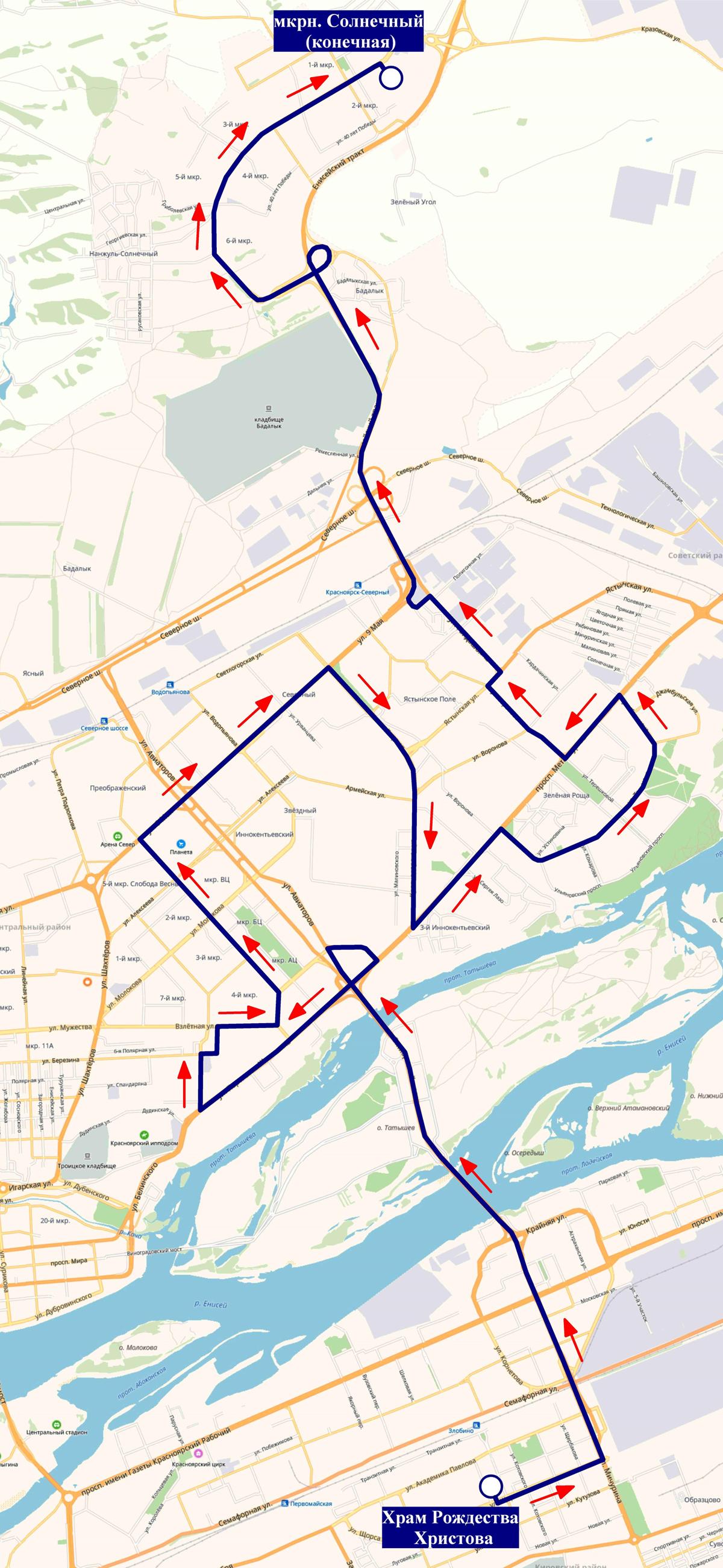 Третий автобус поедет через Октябрьский мост в сторону Взлетки и Северного. Его путь включает улицы Авиаторов, Партизана Железняка, Аэровокзальную, Взлетную, 78 Добровольческой Бригады, 9 Мая и Комсомольский проспект, а завершится в микрорайоне Солнечный.