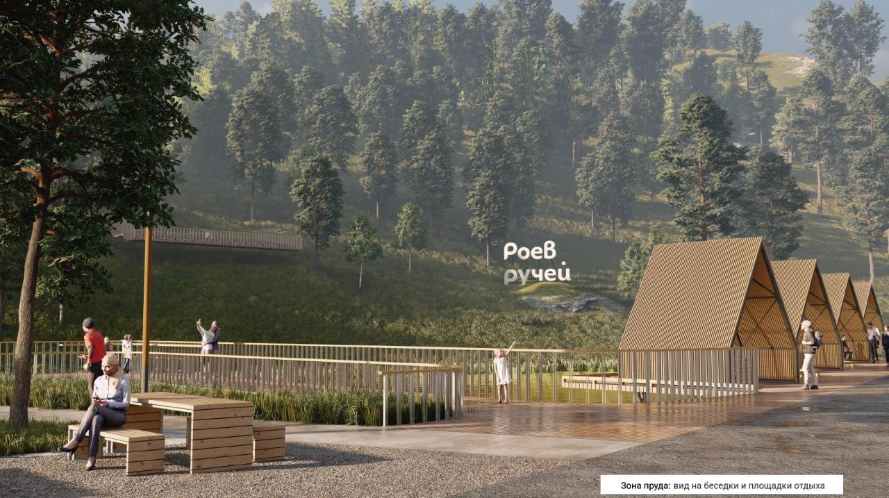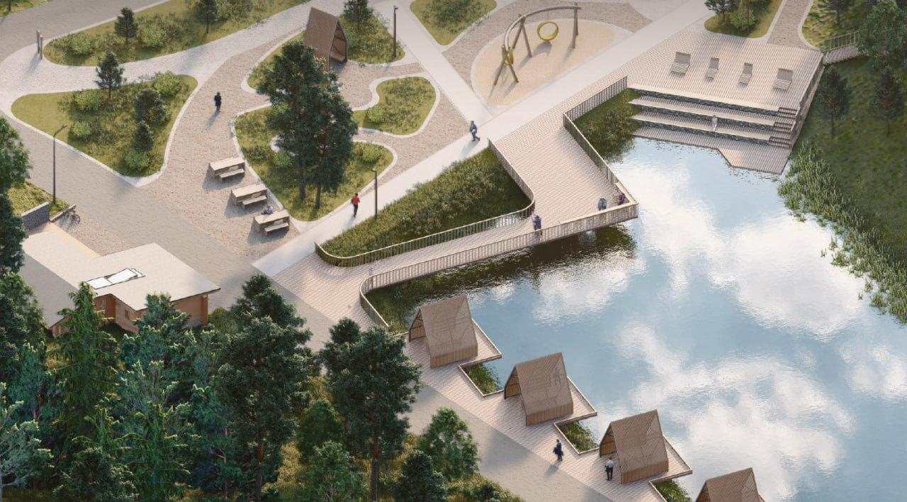 Концепция включает обустройство смотрового комплекса, веревочного парка, экотроп и облагораживание территории у пруда. Эскизы проекта опубликовал депутат Законодательного собрания Илья Зайцев.
