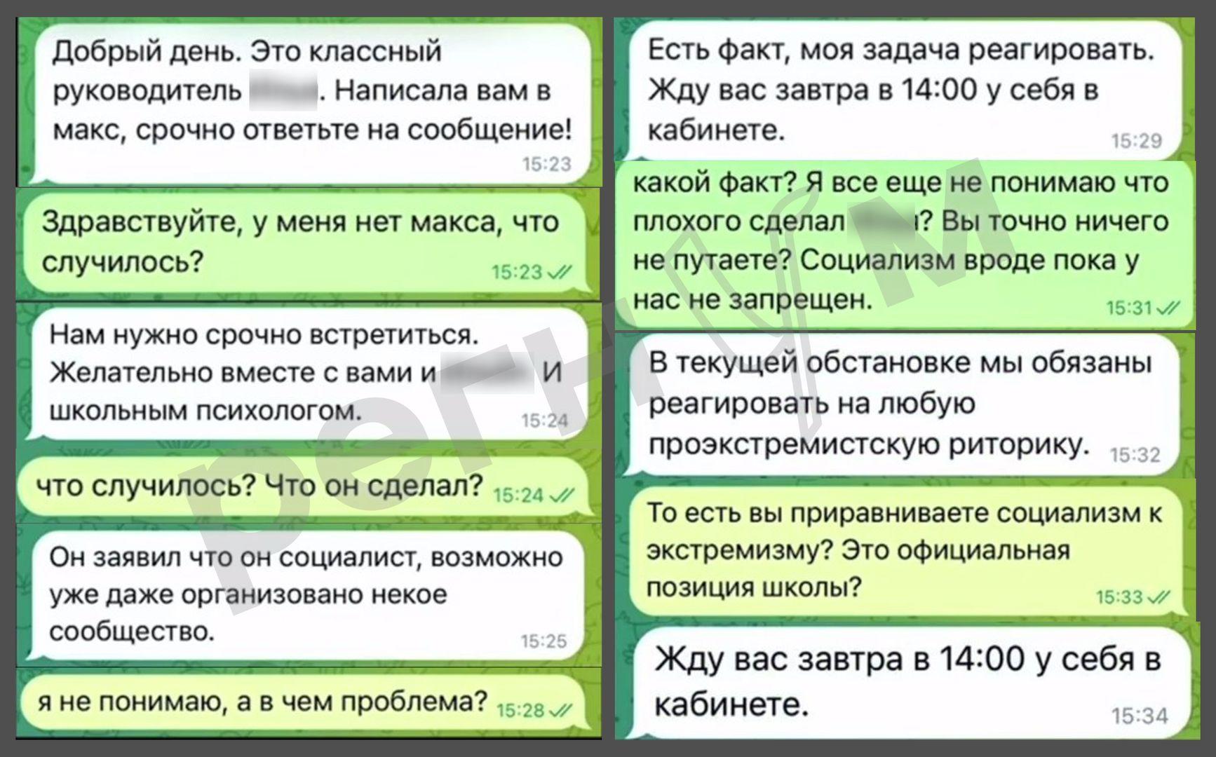 Учительница в переписке с матерью мальчика выразила обеспокоенность. Она предположила, что в учебном заведении уже могло быть создано «сообщество социалистов». «Он заявил, что он социалист, возможно уже организовано некое сообщество. В текущей обстановке мы обязаны реагировать на любую проэкстремистскую риторику», — написала педагог. На прямой вопрос, приравнивается ли социализм к экстремизму, ответа от неё не последовало.