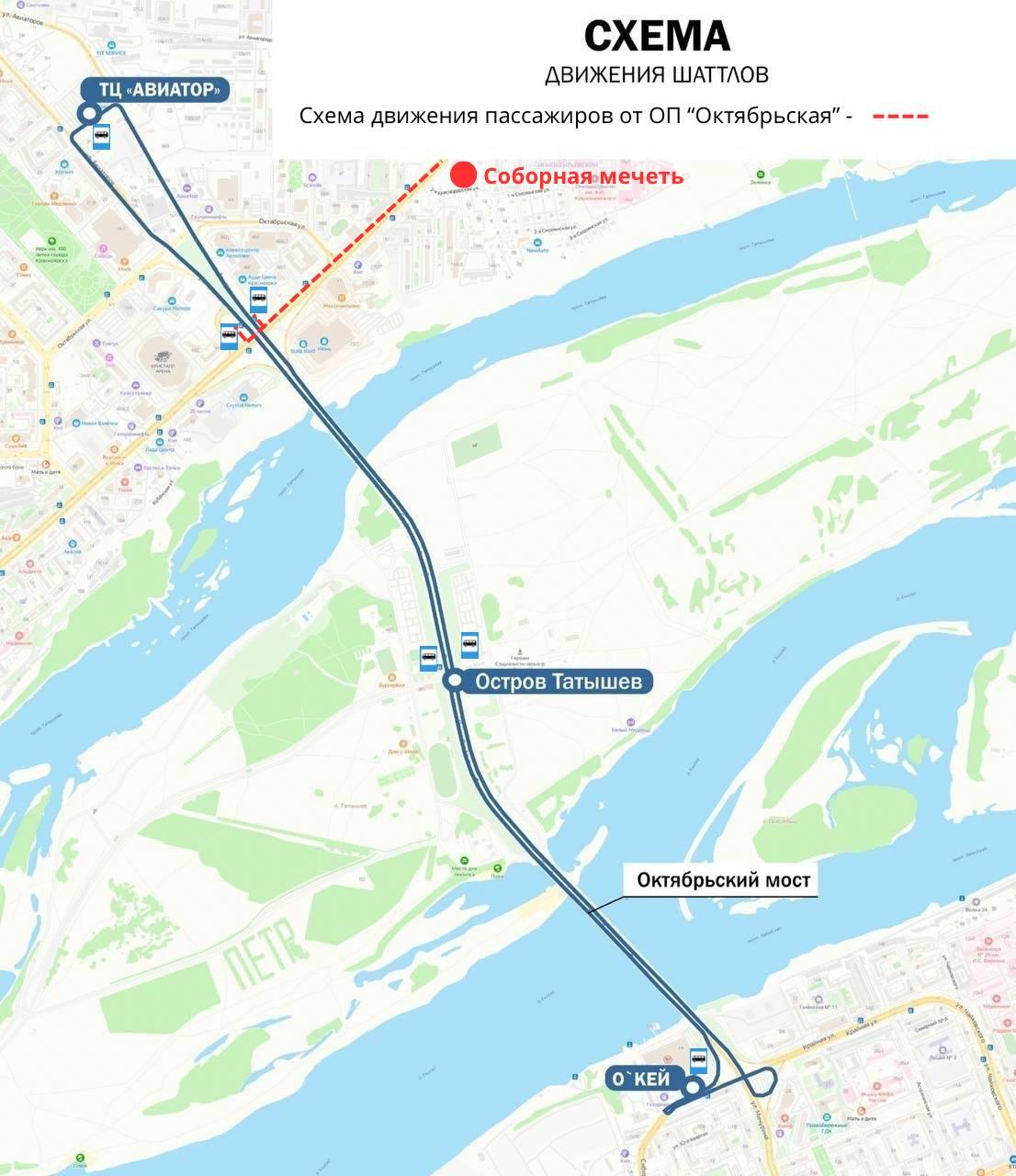 Подъехать к мечети на личном автомобиле будет невозможно. Верующим предложено оставить транспорт на парковках острова Татышев, а также у торговых центров «Июнь» или «Авиатор». Добраться до места можно будет на бесплатных автобусах-шаттлах.