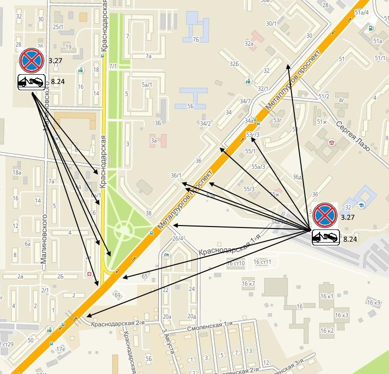 - на улице Краснодарская от строения № 6г до проспекта Металлургов;