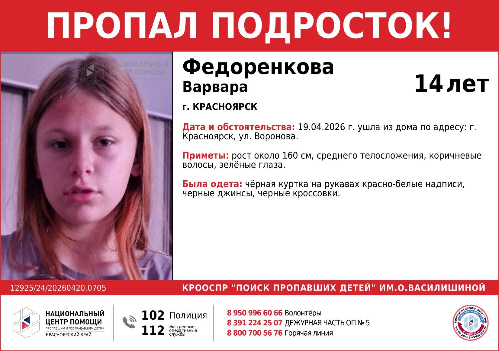 Варвара ушла с улицы Водопьянова. На ней была черная куртка с красно-белыми надписями на рукавах, черные джинсы и черные кроссовки. Ее описание: рост около 160 см, среднее телосложение, коричневые волосы, зеленые глаза.
