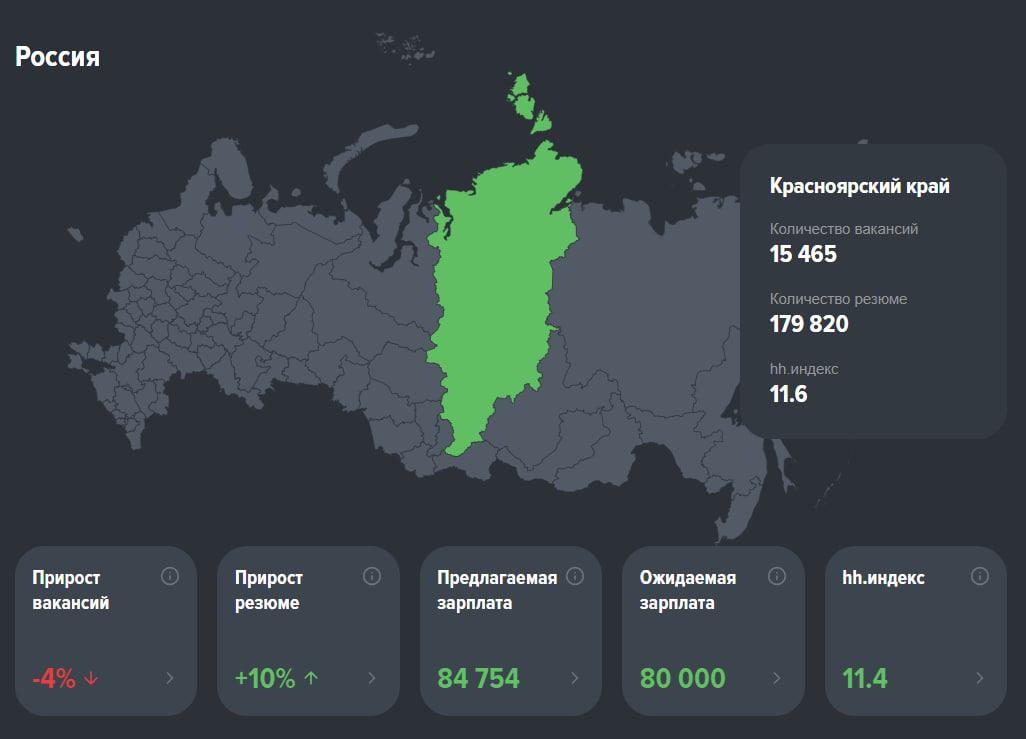 График hh.индекса: соотношение количества резюме к вакансиям в России и Красноярском крае.